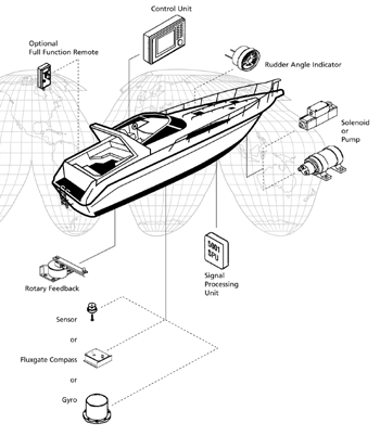 A basic ComNav 5001 electronics package includes: Control Unit, Signal Processing Unit, ComNav Fluxgate Compass or Standard Sensor for a Magnetic Compass, Gyro Interface, Rotary Feedback, output for Solenoids or Reversing Pumps and Interconnecting Cables.